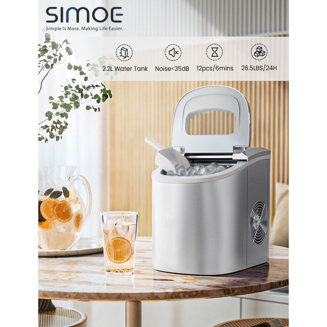 Equipped with a powerful compressor and 9 evaporator columnsWith a 2.2 L water tank, 9 ice cubes will be made within 6-13 minutesCan make up to 26 lbs ice in 24 hoursThe giant ice storage capacity of 1.5lbs Intelligent function with ice-full indicator and water shortage indicatorThe water level mark suggests the right water height and ensures regular useEvaporator column of the nickel-plated surface with R134a refrigerantAutomatic shut-off function when ice basket fullTransparent viewing window, removable ice basket and ice scoopClear control panel, easy to useTransparent windows provide an excellent view to look insideRound and smooth ice, don't hurt mouthHollow Design for better use Big and small size available for different useCan cool drinks, food and make fruits smoothies and moreHelpful for medical treatment and first aid Portable and compact, easy to carryA wide range of personal and commercial use 55 DB low operating noiseFood grade material ensures the safety and healthy ETL certified and FDA certified