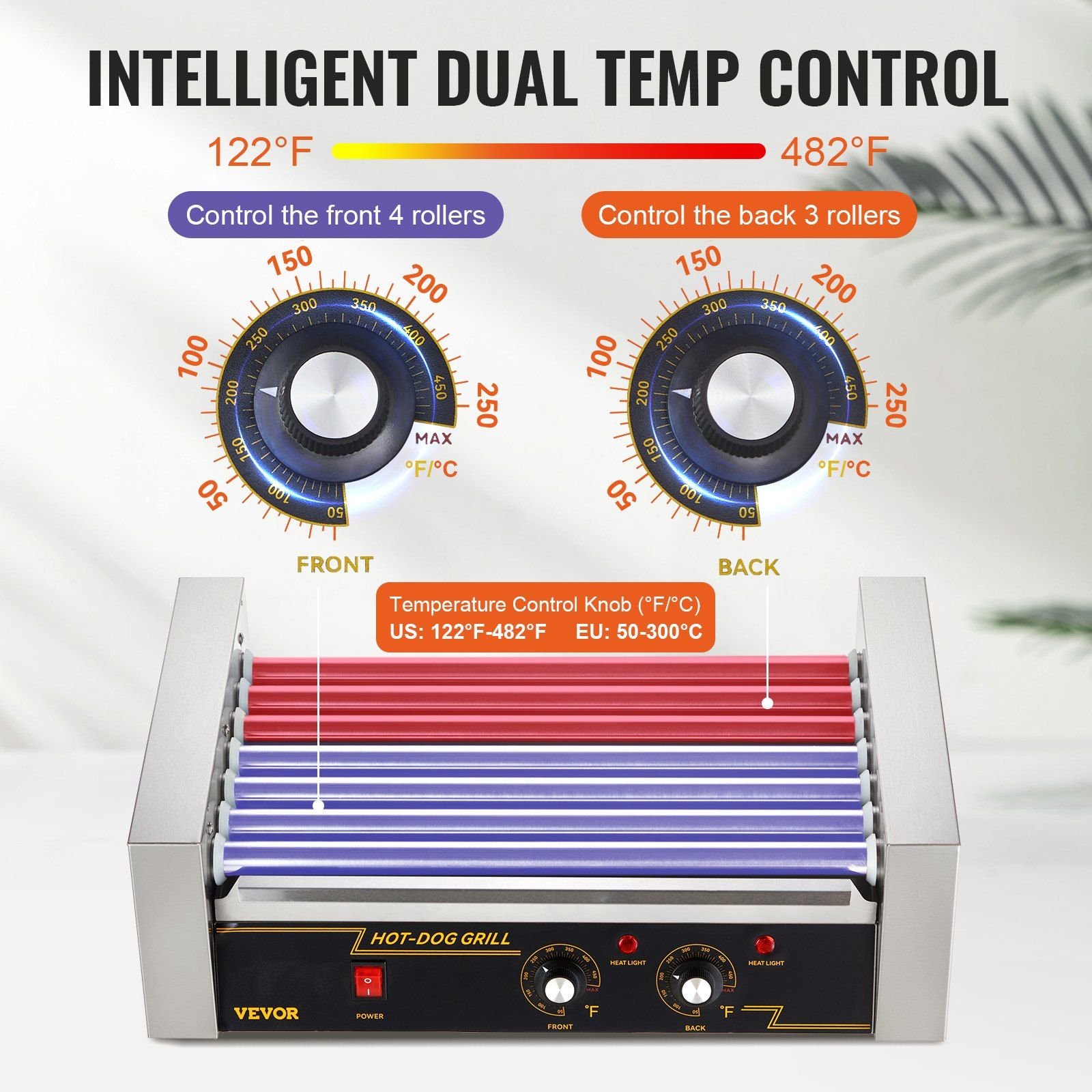 2.Dual-Temperature Dials: Two knobs made it effortless to adjust the cooking temperature up to 482°F separately for front and back rollers. The left knob controls the front 4 rollers, and the right knob controls the back 3 rollers. In this case, it allows back rollers to cook continuously while front rollers keep food hot and ready to serve.