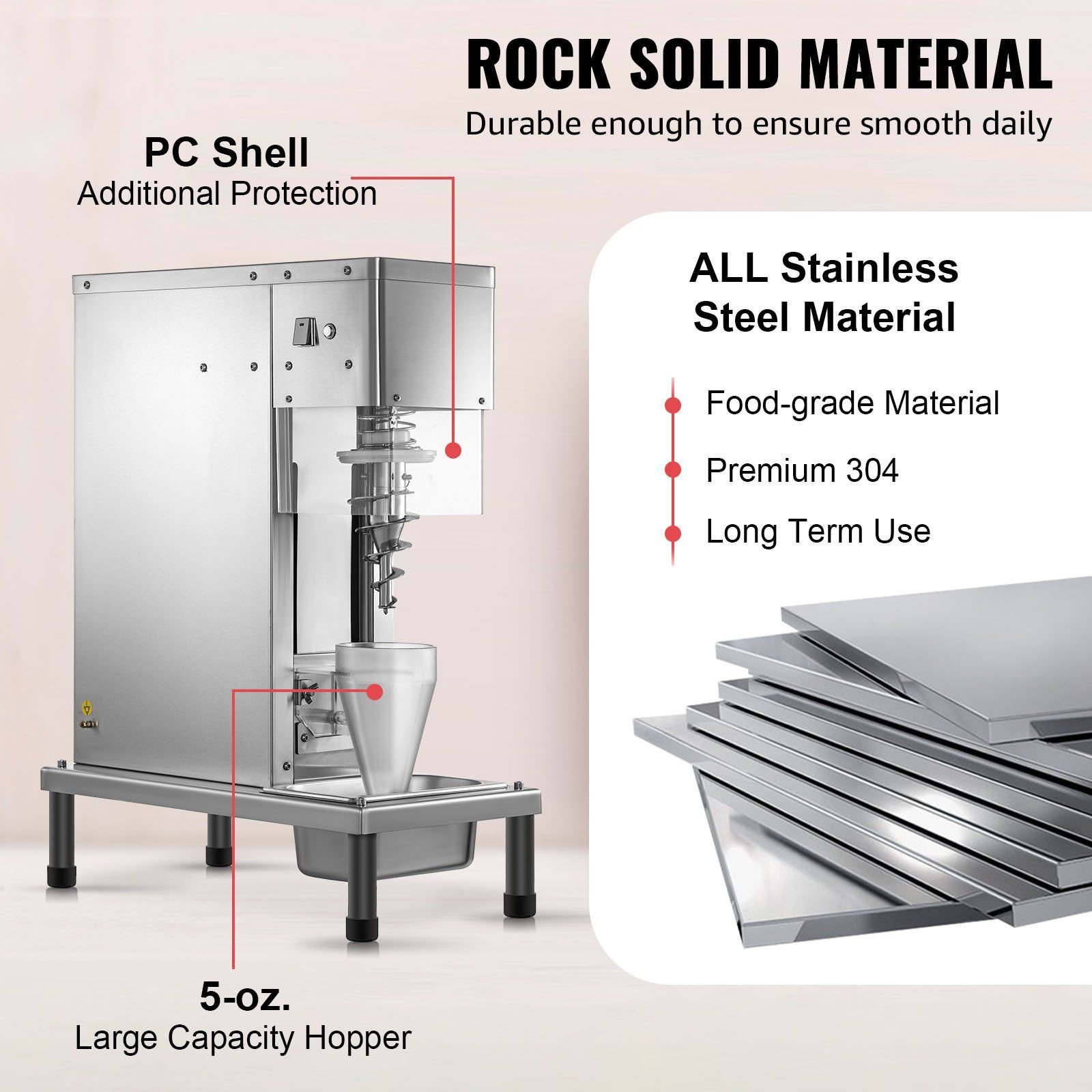 1.Premium Quality: Built with long-lasting 304 stainless steel material, this ice cream blending machine is durable and easy to clean. A brushed finish provides an eye-pleasing appearance. The food-grade PC material hopper with a large capacity (5-oz.) minimizes the number of refills while optimizing the ice-cream stirring. The PC baffle effectively prevents the splash of ingredients.