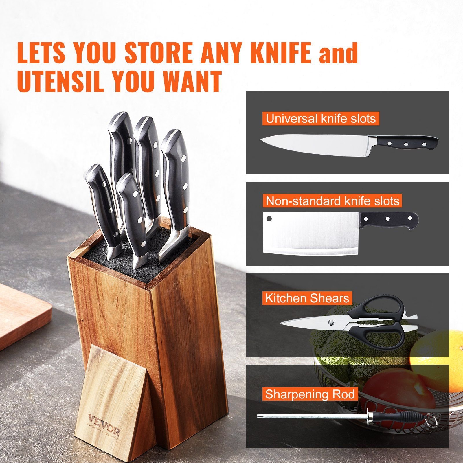 Home > VEVOR Universal Knife Holder, Acacia Wood Knife Block Without Knives, Extra Large Knife Storage Holder Stand with PP Brush