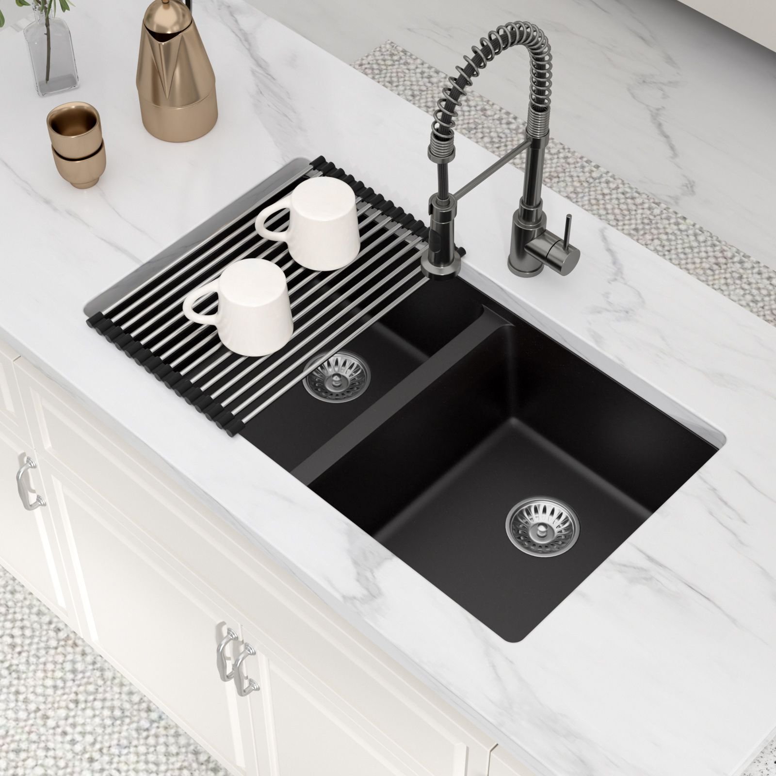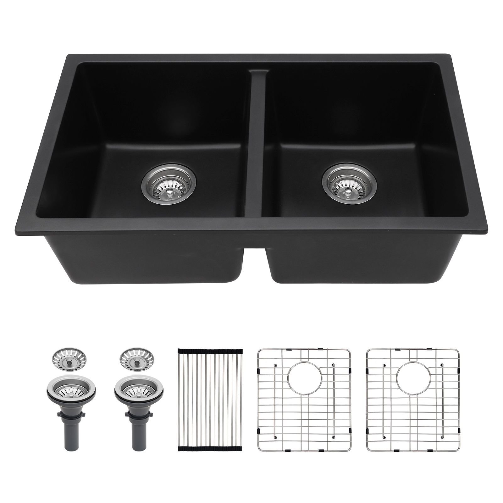 Package include: a undermount quartz kitchen sink, a rolling drying rack, double drainer and bottom grid, mounting hardware and operation instruction.